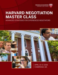 The Program on Negotiation is offering a master-level course for experienced negotiators. The program is taught by five negotiation experts from Harvard Law School, MIT, and the Harvard Kennedy School. If you are selected to participate, you will take part in dynamic exercises with two-way feedback and participate in intensive simulations.