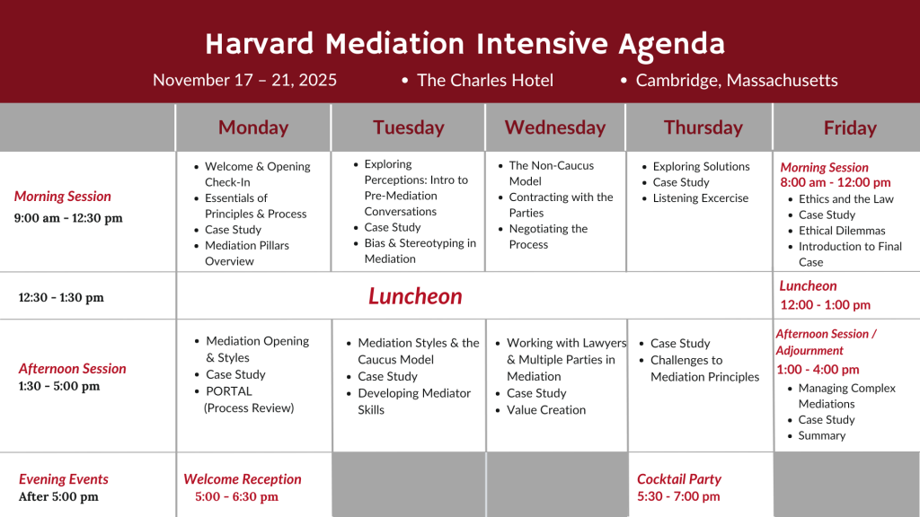 Held at The Charles Hotel in the heart of Harvard Square this fall from November 17–21, 2025, the Harvard Mediation Intensive offers insight into ethical dilemmas, identity-based conflicts, bias and stereotyping, and working with strong emotions throughout the mediation process. By engaging in realistic role-play simulations, you’ll sharpen your core mediator skills including active listening, asking probing questions, developing creative options, reframing, brainstorming, and building sustainable agreements.