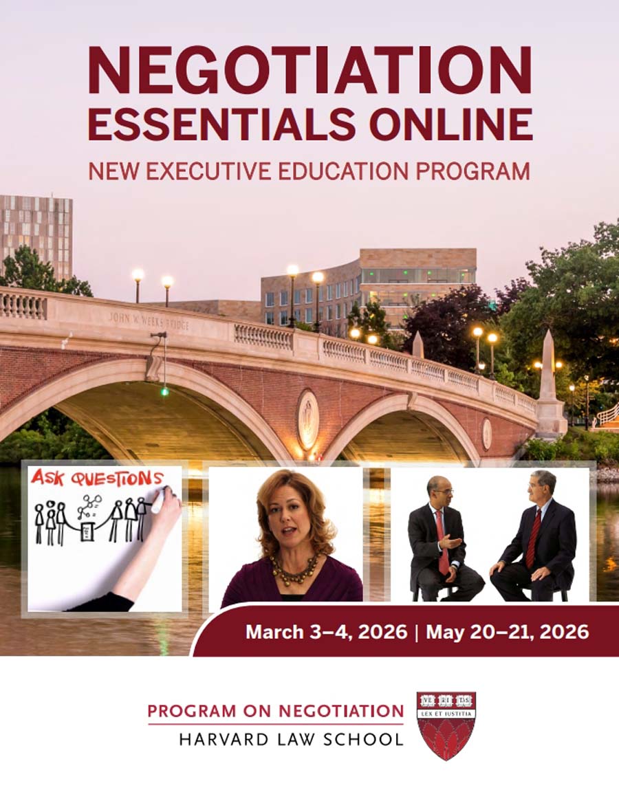 Navigating complex negotiations requires you to manage multiple parties with diverse objectives while continuously solving problems and adapting to new developments. To equip you with the skills to handle these more challenging situations, the experts at the Program on Negotiation have developed Managing Complex Negotiations: Strategies for Success. … LEARN MORE ABOUT THIS PROGRAM